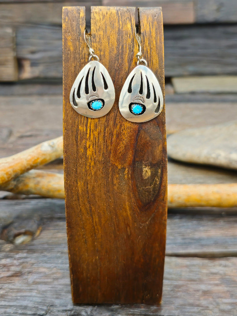 These shadowbox earrings are made with sterling silver in the shape of a bear paw and feature a small turquoise stone.  Made by Navajo silversmith ...