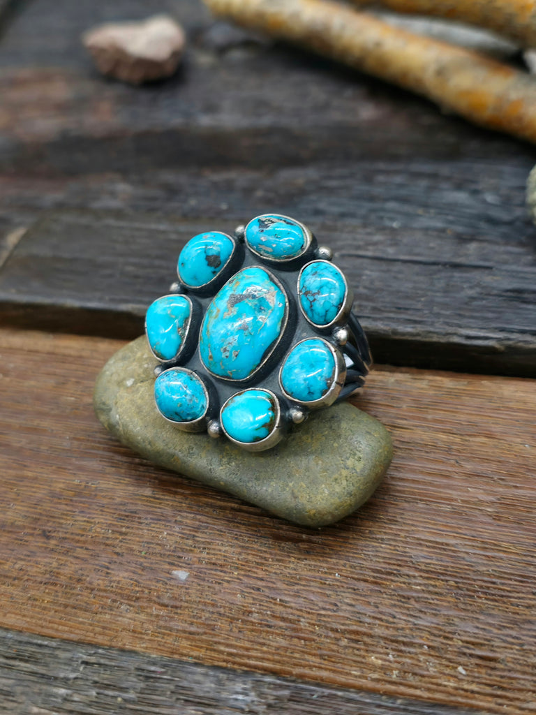 Blue Turquoise Cluster Sterling Silver Ring by Annie Hoskie All jewelry is handcrafted by Indigenous Artists.  Dimensions: Size 8 Adjustable w/ ...