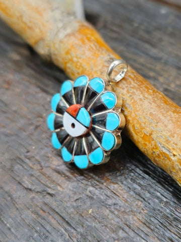 Turquoise, Coral, Mother of Pearl Inlay Sun Face Pendant by Romero Vacit - 1 inch