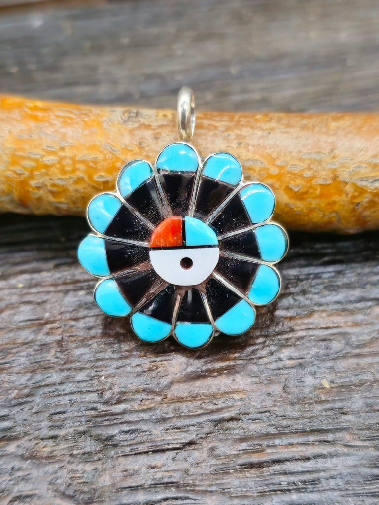 Turquoise, Coral, Mother of Pearl Inlay Sun Face Pendant by Zuni silversmith Romero Vacit. Individual stones will vary. All jewelry is handcrafted ...