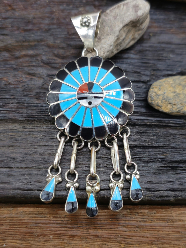 Turquoise, Coral, Mother of Pearl Inlay Sun Face Pendant with Dangles by Burdain Soseeah