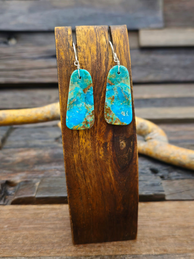 Turquoise Slab Earrings by Marcella Castillo. All jewelry is handcrafted by Indigenous Artists.  Dimensions: approx. 2 by 3/4 in.