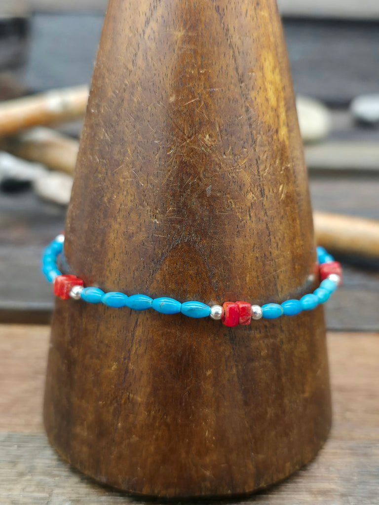 Turquoise, Sponge Coral, and Sterling Silver Bracelet. All jewelry is handcrafted by Indigenous Artists.  Dimensions: Length - 8 in.