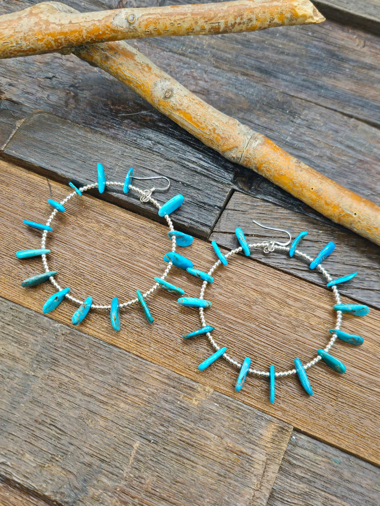 Turquoise Tab and Sterling Silver Bead Hanging Hoop Earrings. Individual stones will vary. All jewelry is handcrafted by Indigenous Artists.  Di...