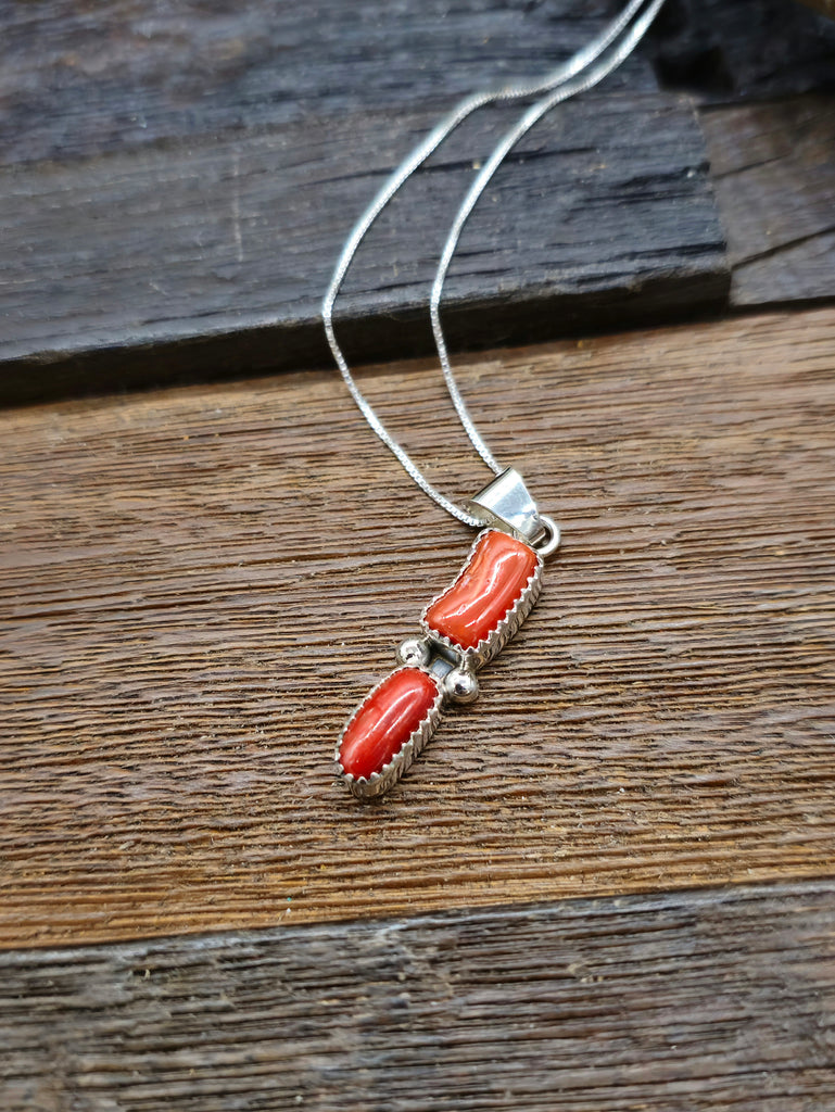 Two Stone Coral Pendant on 18 in. Sterling Silver Chain.  Individual stones will vary. All jewelry is handcrafted by Indigenous Artists.  Dimens...