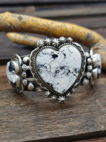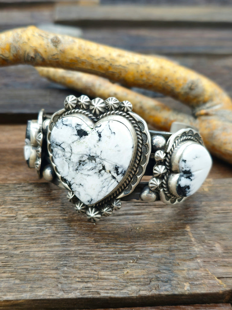 White  Buffalo Heart Cuff by Navajo silversmith J. Nelson  All jewelry is handcrafted by Indigenous Artists.  Dimensions: Internal Circumference...