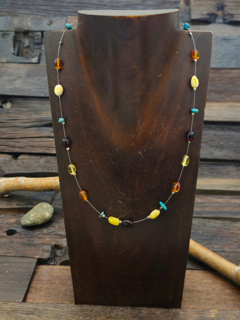 Yellow, Red, and Orange Amber and Turquoise Necklace - 18 in. NON-NATIVE MADE