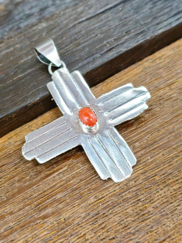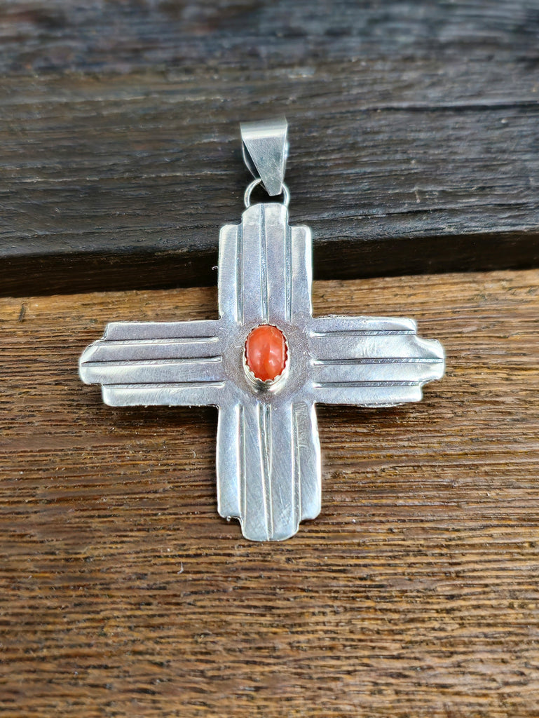 Zia Sterling Silver Pendant with Small Coral Stone by Lucille Platero