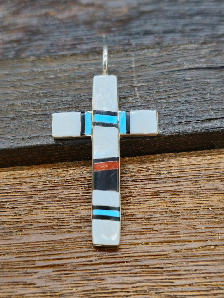 Zuni Multistone Inlay Cross Pendant by Bobby Sanchez - 2 by 1 in.