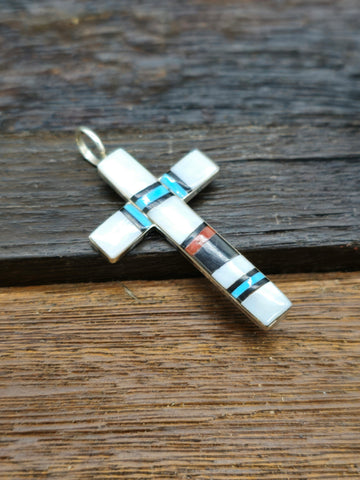 Sterling Silver Zuni Multistone Inlay Cross Pendant by Bobby Sanchez.  Stones used include jet, turquoise, mother-of-pearl, and coral. All jewelry ...